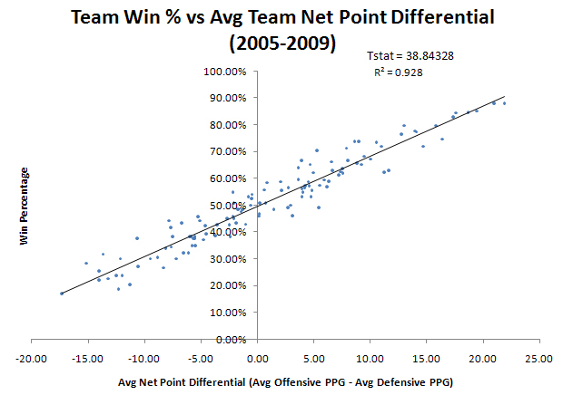 James’ formula does not hold up well for college football, but the principle of there being a close relationship between a team’s overall winning percentage and its season-long scoring margin does. In this sample of five seasons (2005-2009), the average scoring margin is highly predictive of a team’s winning percentage. In fact, it explains nearly 93% of the variation in winning percentage, as shown below.