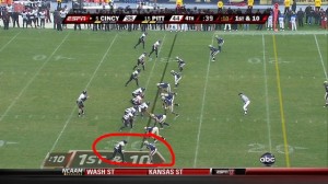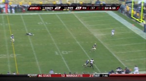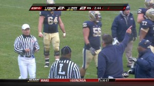 Cincinnati DE Matthews has a slight grab on Pitt RB Deion Lewis’ facemask as he tackles him—no call by the referees. Wannstedt is incensed, jumping up and down and pointing at the Heinz field jumbotron. The clock keeps moving, so Pitt has to run another play.