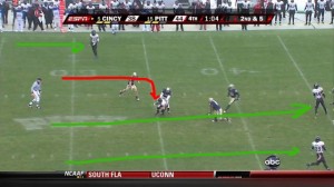 Pitt comes out of the timeout and shows a five-man pass rush against Cincinnati, who is lined up with five receivers. This is an extremely aggressive call given the situation and forces Pitt into man-coverage with a single safety playing the middle of the field. The single receiver at the bottom of the formation is Armon Binns, who is being projected to go higher in next year’s NFL draft than his teammate Gilyard, so this seems like a pretty easy tactical decision for Cincinnati.