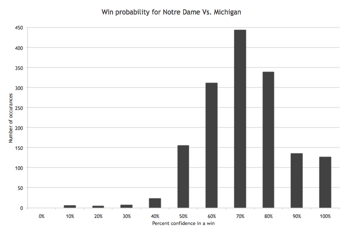 From a simplistic perspective, the voting distribution described by this histogram translates to an average win probability of 71.4 percent and a standard deviation of 15 percent. Expressed differently, the majority of those polled (67.4 percent) believe the Irish have a 70 percent or better chance of beating Michigan, while 87.5 percent of voters believe Notre Dame has at least a 60 percent chance of beating the Wolverines.