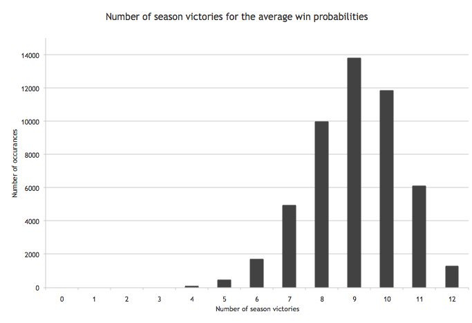 As noted above, summing the individual win probabilities is a simple way to generate a season win total. But what about the variation of that win total? This is where Monte Carlo simulations are of value.