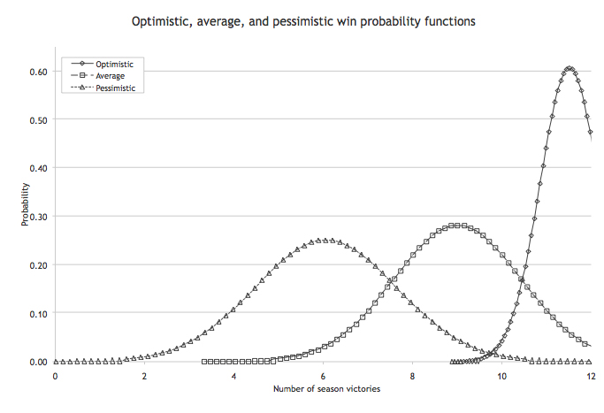 The plot below shows the normalized probability functions for the optimistic, average and pessimistic season win predictions. The average curve is effectively a discretized version of the histogram above, normalized to an integrated probability of unity.